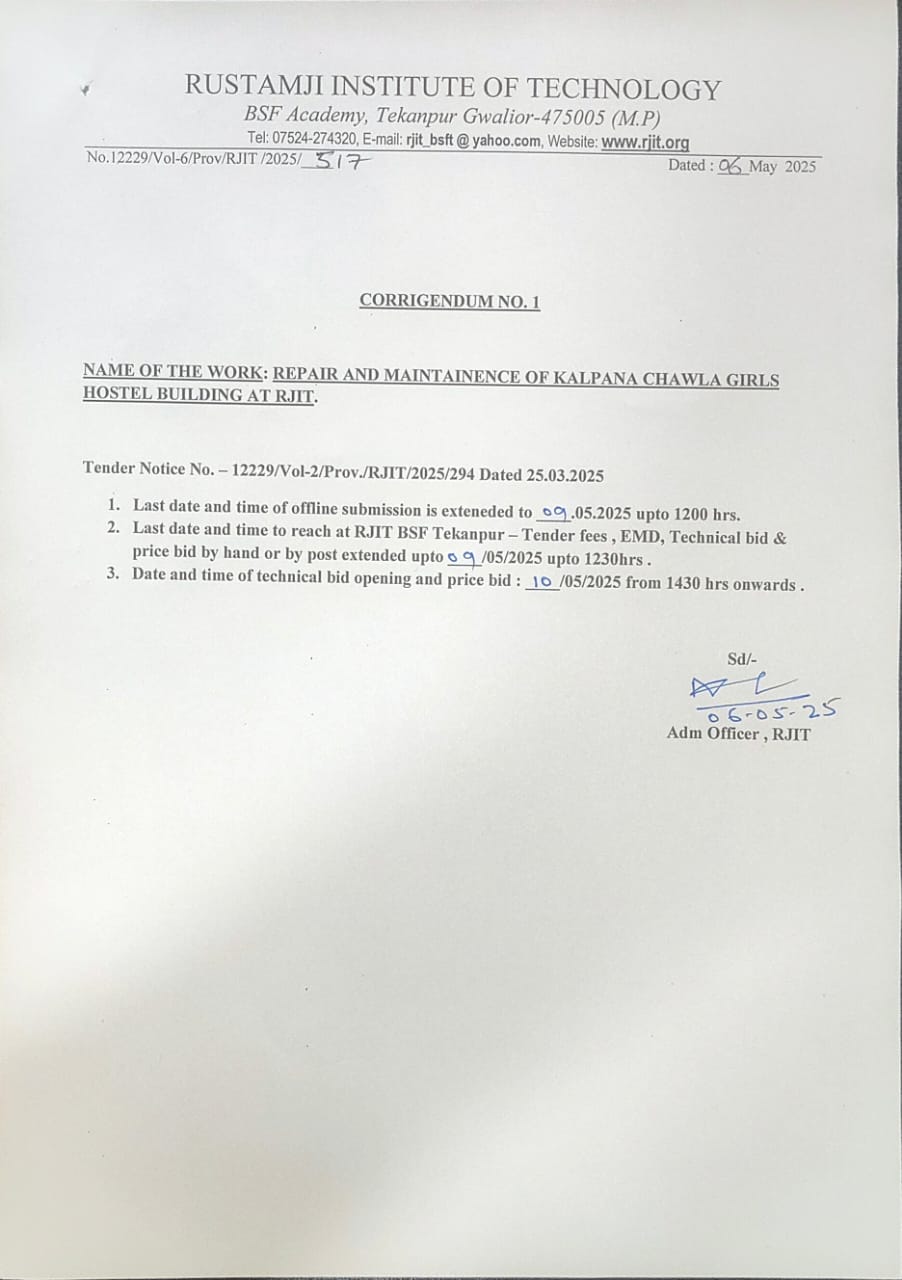 Corrigendum: Repair and Maintenance of Kalpana Chawla Girls Hostel Building at RJIT
